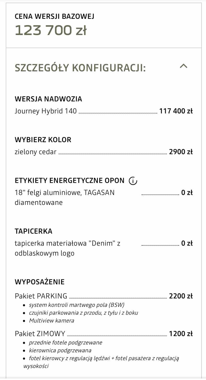 Najdroższą wersją jaką możemy wybrać w cenniku jest Extreme lub Journey. Najpierw skupimy się na tej drugiej. Z silnikiem ECO-G 100 KM z fabryczną instalacją gazową kosztuje zł 93.900 zł, ale do celów tego zestawienia wybierzemy droższą o 23.500 zł wersję z napędem full hybrid o mocy 140 KM. Pod maską pracuje tam silnik 1.6, współpracujący z napędem elektrycznym. Cena takiej odmiany to 117.400 zł. Dobieramy do niej modny kolor zielony cedar za 2900 zł i dwa pakiety.