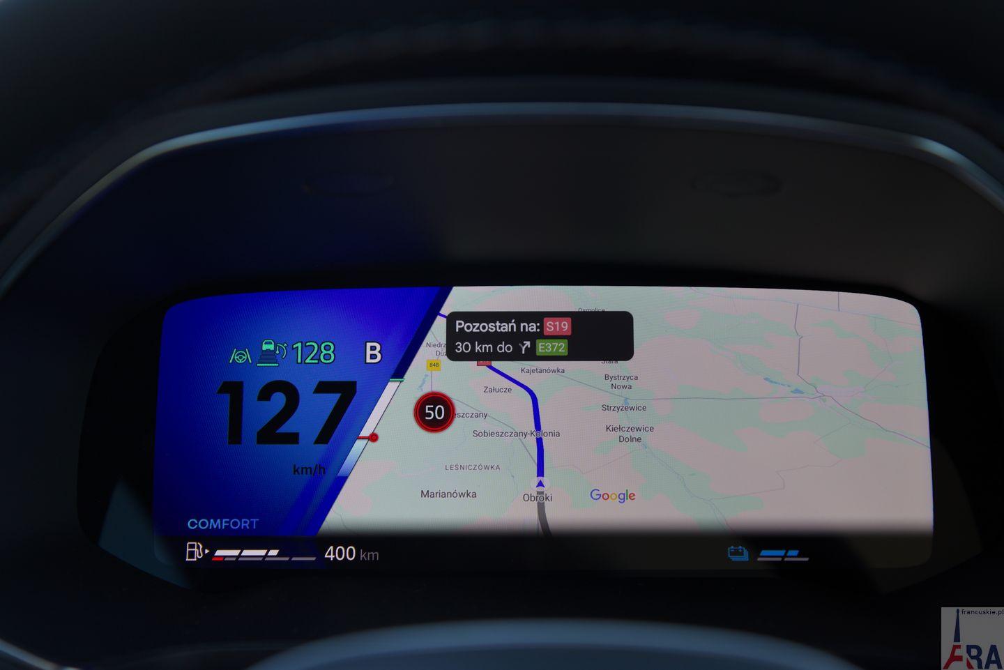 Testowany Renault Symbioz miał takich elementów wiele i działają one naprawdę nieźle. W zasadzie miałem zastrzeżenia tylko do dwóch rzeczy. Pierwsza, to nadwrażliwy system podczas cofania – potrafił nagle zatrzymać samochód podczas wjeżdżania tyłem na podjazd, na którym nie było żadnej przeszkody. Owszem, podjazd jest lekko podniesiony względem ulicy, z której na niego wjeżdżam, ale wjazd jest zrobiony gładko. Nie wiem, skąd ta reakcja. Druga kwestia, to ograniczenia prędkości, które Symbioz bierze nie wiadomo skąd. OK, coś tam bierze z nawigacji, resztą z kamery, ale czasem pokazuje, jako obowiązujące, prędkości, które nijak mają się do faktycznego na danym odcinku ograniczenia. Szczególnie mocno widać to było na drogach szybkiego ruchu, jakimi się poruszałem. Przykład – na zdjęciu poniżej. Auto „wiedziało”, że jest na ekspresówce, a i tak pokazywało limit 50 km/h.