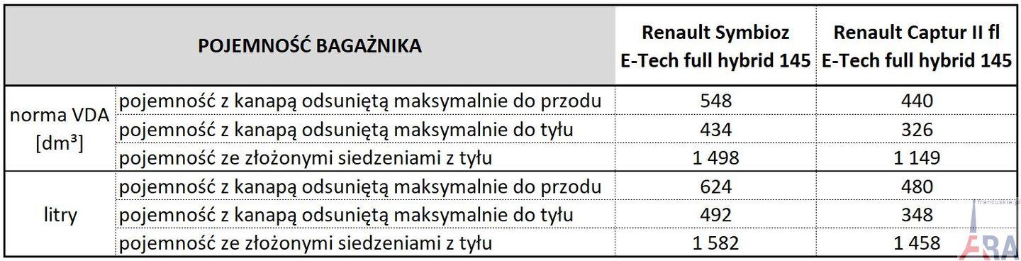 Warto jednak zauważyć, że w porównaniu z wersjami spalinowymi Captura pojemność bagażnika hybrydowego Symbioza liczona wg normy VDA jest już tylko nieznacznie większa, a w litrach nawet odrobinę mniejsza.