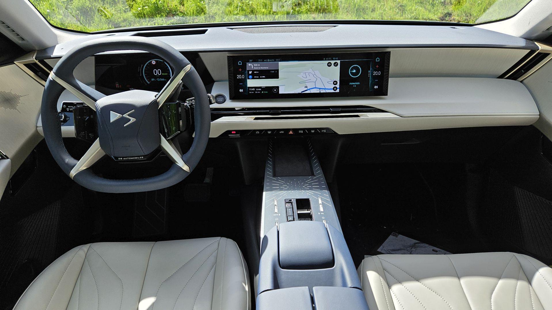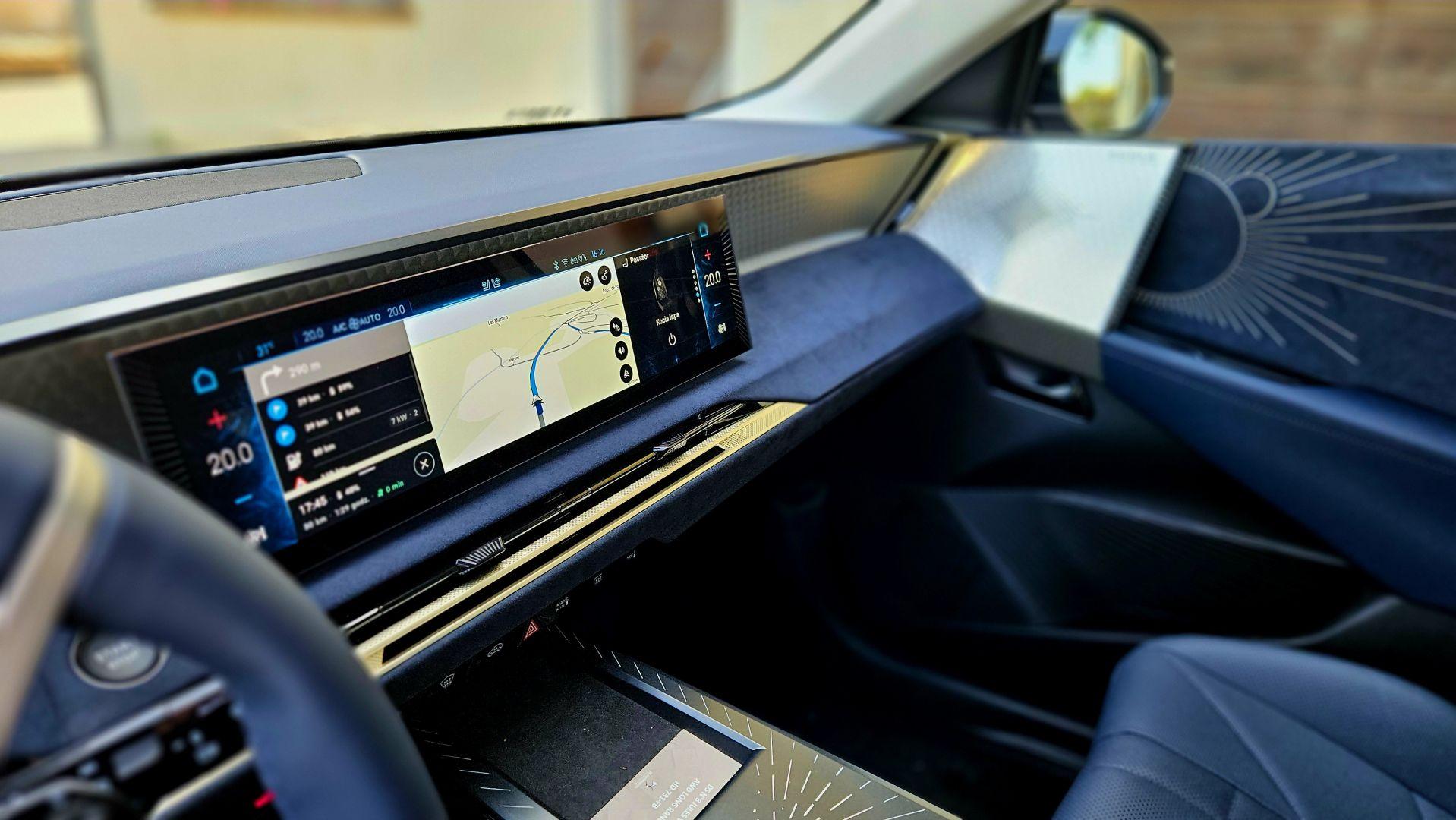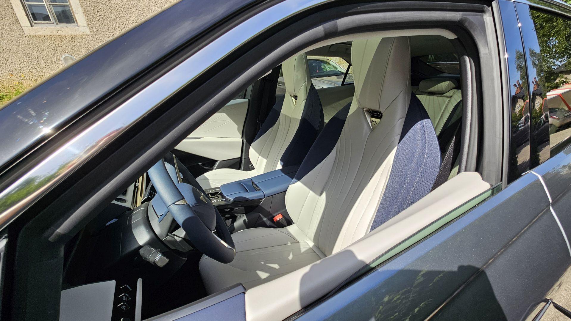Wysoki poziom wykończenia idzie w parze ze znakomitą sferą multimedialną wraz z nowym systemem DS Iris 2.0 z wybieraniem głosowym i funkcją ChatGPT. Do dyspozycji mamy łącznie trzy ekrany. 16-calowy wyświetlacz dotykowy został położony wysoko, ale nie na tyle, by zaburzyć ergonomię użytkowania, czy projekt wnętrza – górna krawędź biegnie tuż przy linii deski rozdzielczej. Informacje na temat jazdy dostarcza 10,25-calowy ekran wskaźników oraz rozszerzony Head-up Display, który na wysokości wzroku kierowcy a właściwie na drodze przed nim wyświetla aktualną prędkość samochodu, obowiązujące ograniczenie a także wskazówki mapy nawigacji. Kamera cofania daje wyraźny, wysokiej jakości obraz, ale nie do końca przekonuje mnie cyfrowe lusterko. Moje oczy potrzebowały chwili, by przywyknąć do wyświetlanego obrazu, niemal przy każdym spojrzeniu, poza tym, ciągle wydawało mi się, że obiekty za samochodem wyświetlane są bliżej niż powinny.
