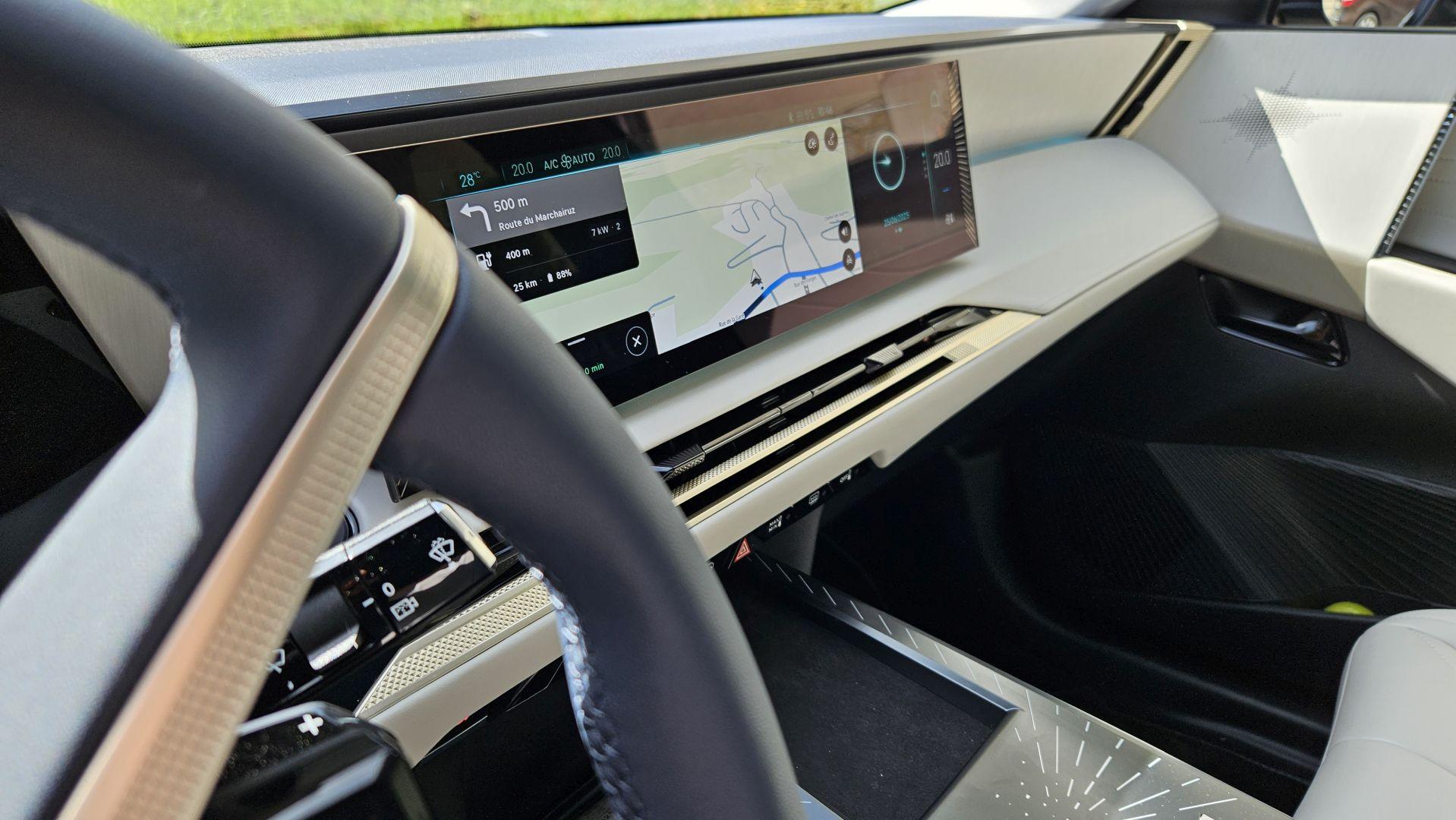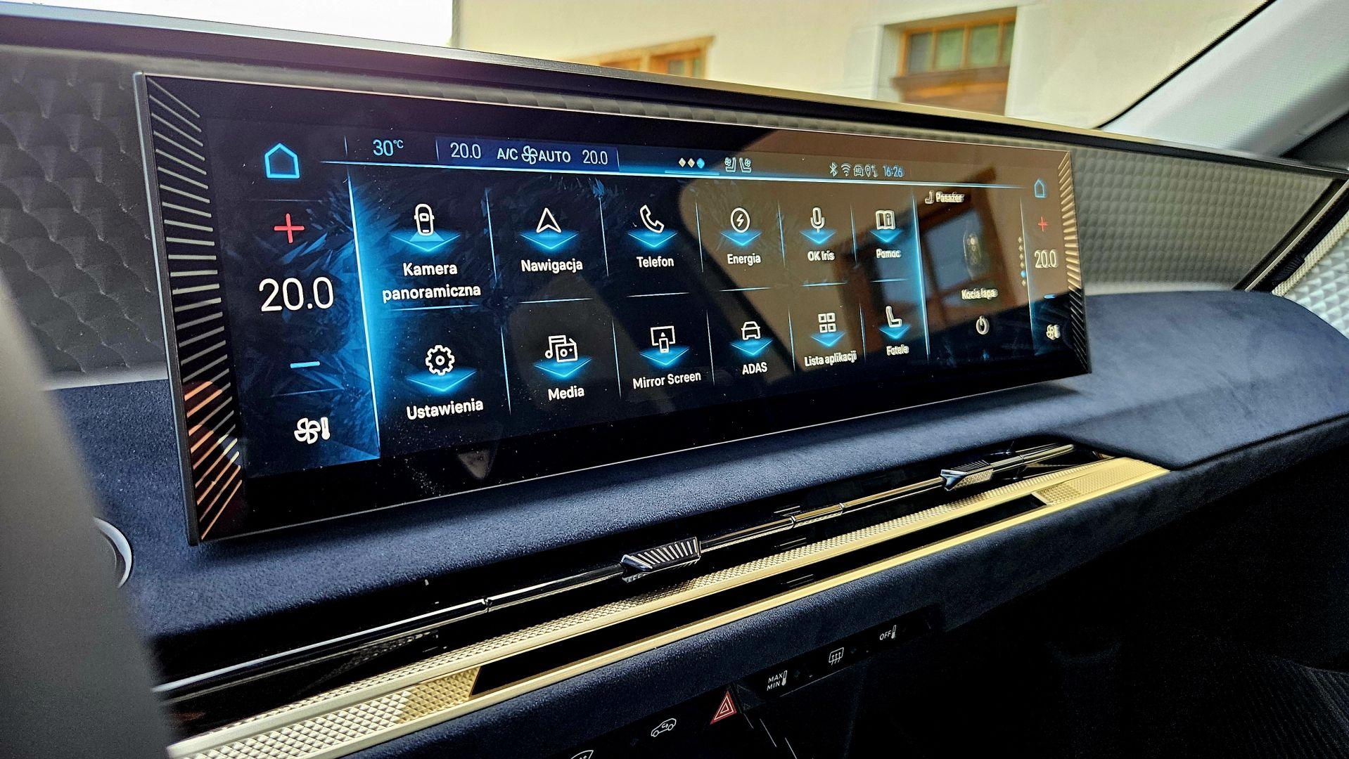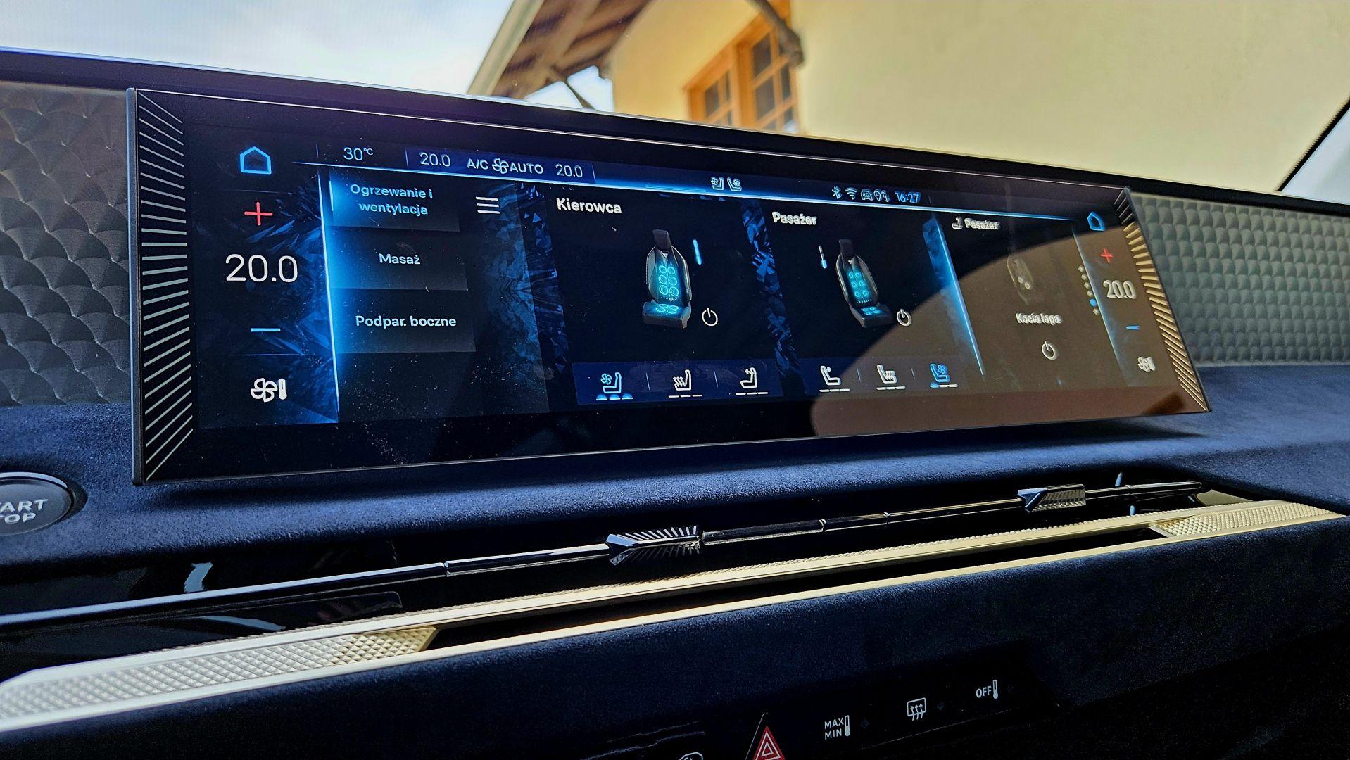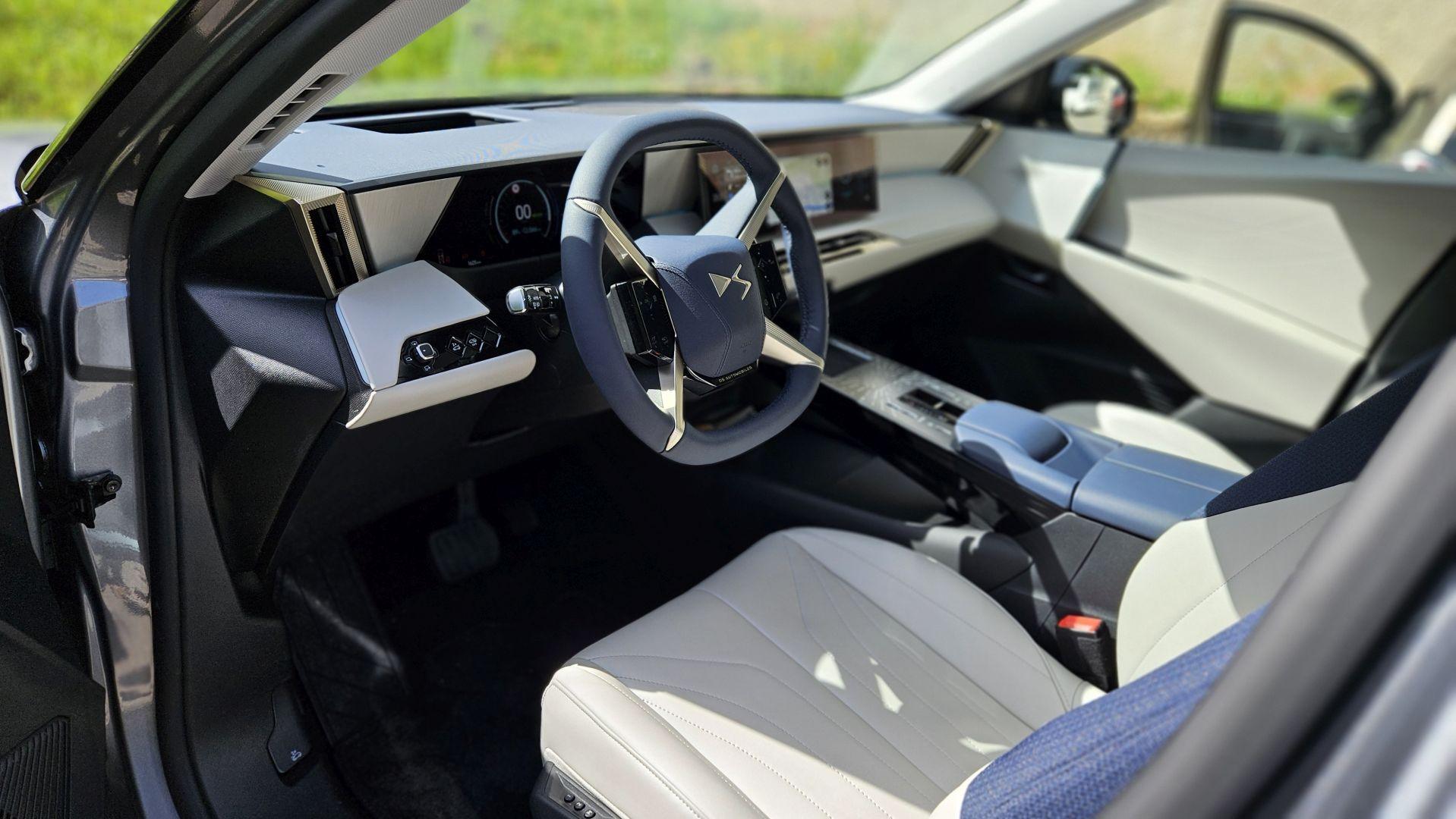 Wysoki poziom wykończenia idzie w parze ze znakomitą sferą multimedialną wraz z nowym systemem DS Iris 2.0 z wybieraniem głosowym i funkcją ChatGPT. Do dyspozycji mamy łącznie trzy ekrany. 16-calowy wyświetlacz dotykowy został położony wysoko, ale nie na tyle, by zaburzyć ergonomię użytkowania, czy projekt wnętrza – górna krawędź biegnie tuż przy linii deski rozdzielczej. Informacje na temat jazdy dostarcza 10,25-calowy ekran wskaźników oraz rozszerzony Head-up Display, który na wysokości wzroku kierowcy a właściwie na drodze przed nim wyświetla aktualną prędkość samochodu, obowiązujące ograniczenie a także wskazówki mapy nawigacji. Kamera cofania daje wyraźny, wysokiej jakości obraz, ale nie do końca przekonuje mnie cyfrowe lusterko. Moje oczy potrzebowały chwili, by przywyknąć do wyświetlanego obrazu, niemal przy każdym spojrzeniu, poza tym, ciągle wydawało mi się, że obiekty za samochodem wyświetlane są bliżej niż powinny.