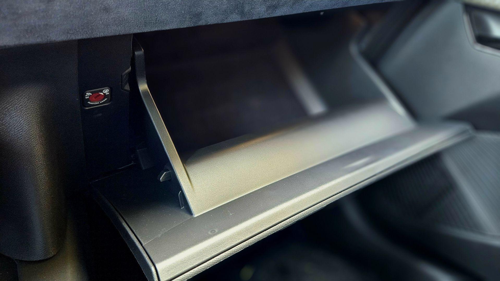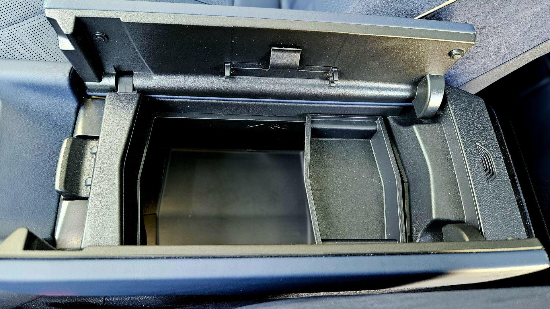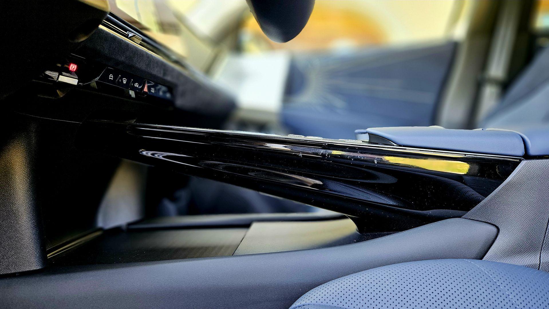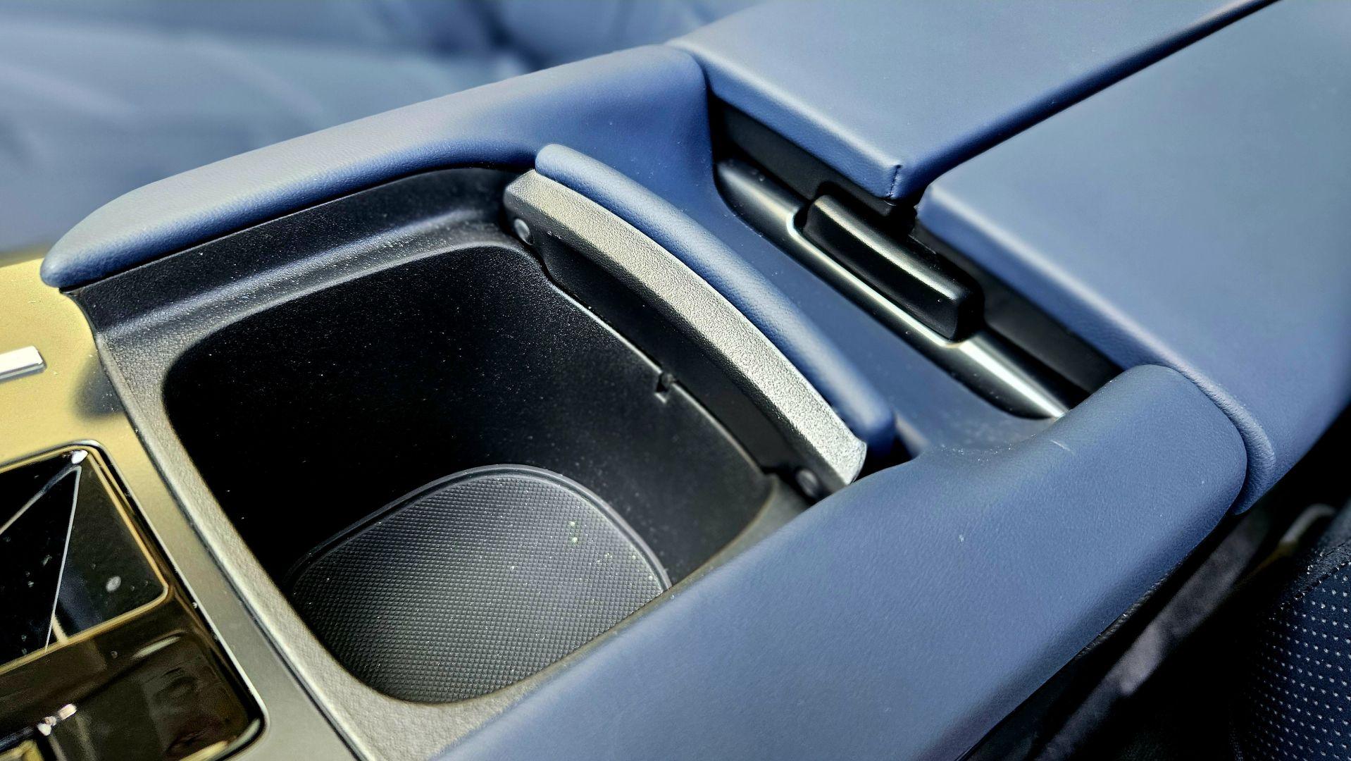Materiały zastosowane na konsoli centralnej są matowe i sprawiają wrażenie odpornych na zarysowania, do minimum ograniczono wykorzystanie fortepianowej czerni, która lubi zbierać kurz i odciski palców. Zdobiona gwiezdnym wzorem konsola centralna ma dwa poziomy. Chociaż dolny wymusza sięganie ręką nieco głębiej do cup-holderów i gniazdek USB, daje dodatkowe możliwości przechowywania przedmiotów, które wnosimy do samochodu. Najważniejsze funkcje jak selektor zmiany biegów i dodatkowa, zamykana podstawka pod kubek i tak znajdują się na pierwszym piętrze obok przycisków do ustawiania trybów jazdy.