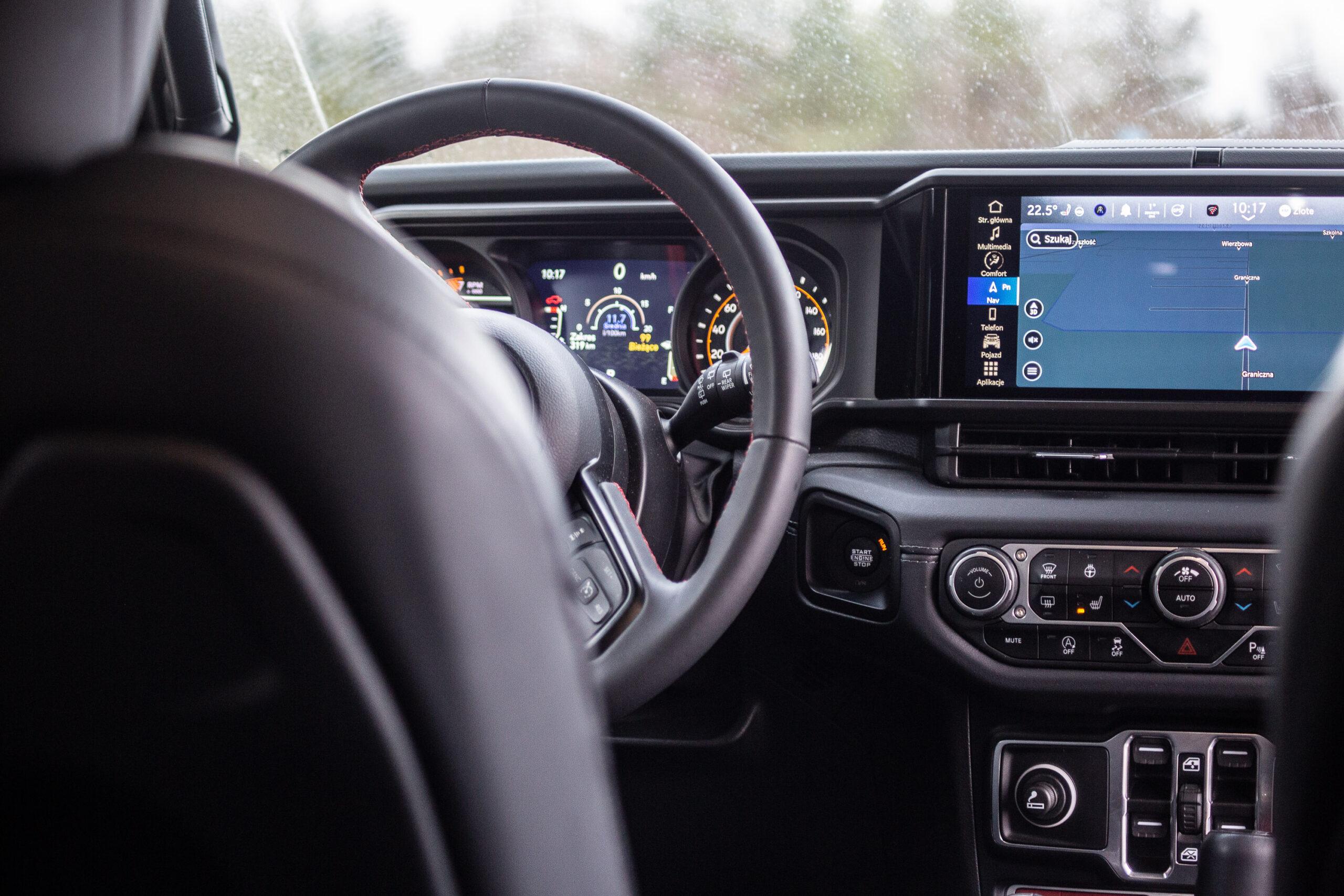 Pozycja za kierownicą jest wysoka, co daje dobrą widoczność w terenie, choć wymaga chwytania się specjalnej rączki podczas wsiadania i wysiadania. Wnętrze zachowuje jednak surowy charakter – widoczne śruby i masywne materiały przypominają o terenowym dziedzictwie Wranglera. Nie ma tu też mowy o typowym komforcie znanym z osobówek, szczególnie gdy ruszymy.